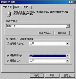 这种情况是因为没有取消屏幕保护或电源管理设置不当所引起。解决办法是从监控系统退出到WINDOWS操作系统界面后,在界面上点击鼠标右键,选择“属性”后,在出现的标签里选择屏幕保护,选择(无)一项解除屏保。然后点击右下角的设置按钮,在电源使用方案里选择"始终打开",系统等待选择"从不",关闭监视器出选择"从不",“关闭硬盘”处选择"从不",较后点击“确定”即可。